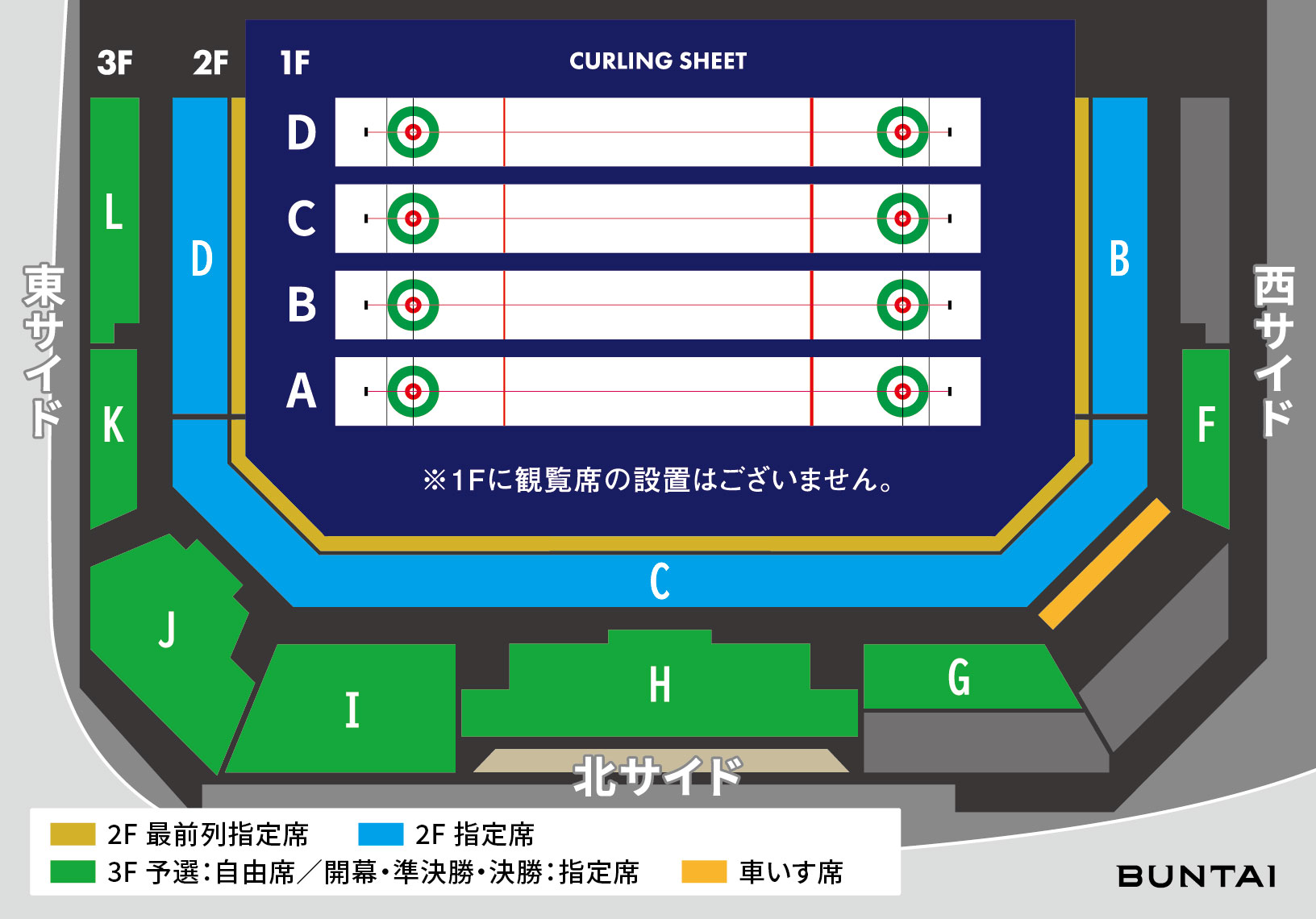 ※ 競技は東サイドから開始します。最初のエンドは東サイドから西サイドに向かって投球し、1エンドが終了すると次のエンドは西サイドから東サイドに向かって投球します。